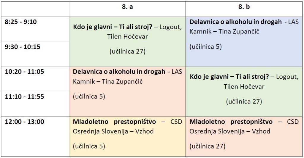 Naravoslovni dan bo potekal v sredo, 22. 10. 2026. V razredih bodo potekale delavnice na temo Odvisnosti.